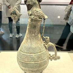 本次展出的青铜匏壶即出土于赵卿墓。此壶高40.8厘米,最大腹径18.2厘米,壶盖为圆雕的鸷鸟形捉手,鸟喙大张,双目圆睁,全身饰精美的羽翎纹,爪抓两条奋力挣扎的小龙。鸟腹下有子口凸榫,套于壶体母口内。壶颈长而侧倾于一侧,鼓腹上有一虎形,虎口衔一环,有链条与盖鸟尾连接。