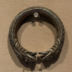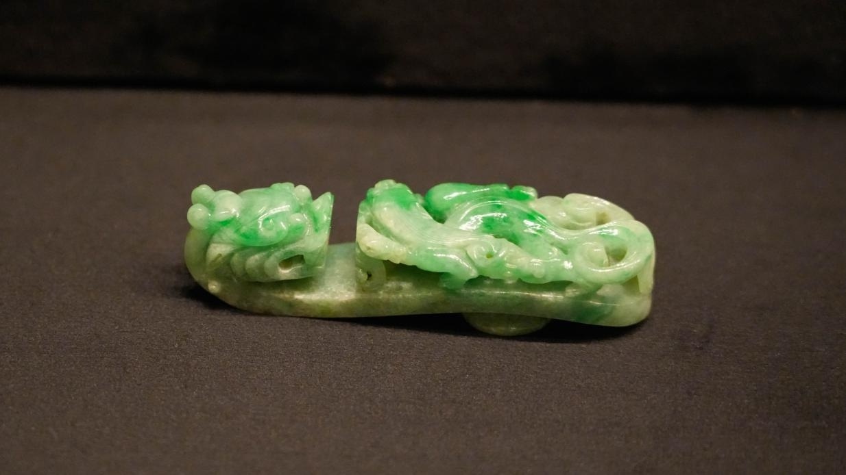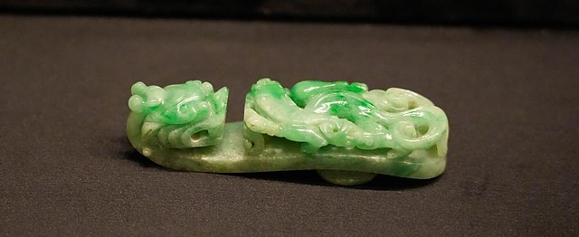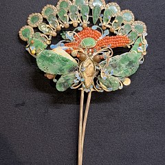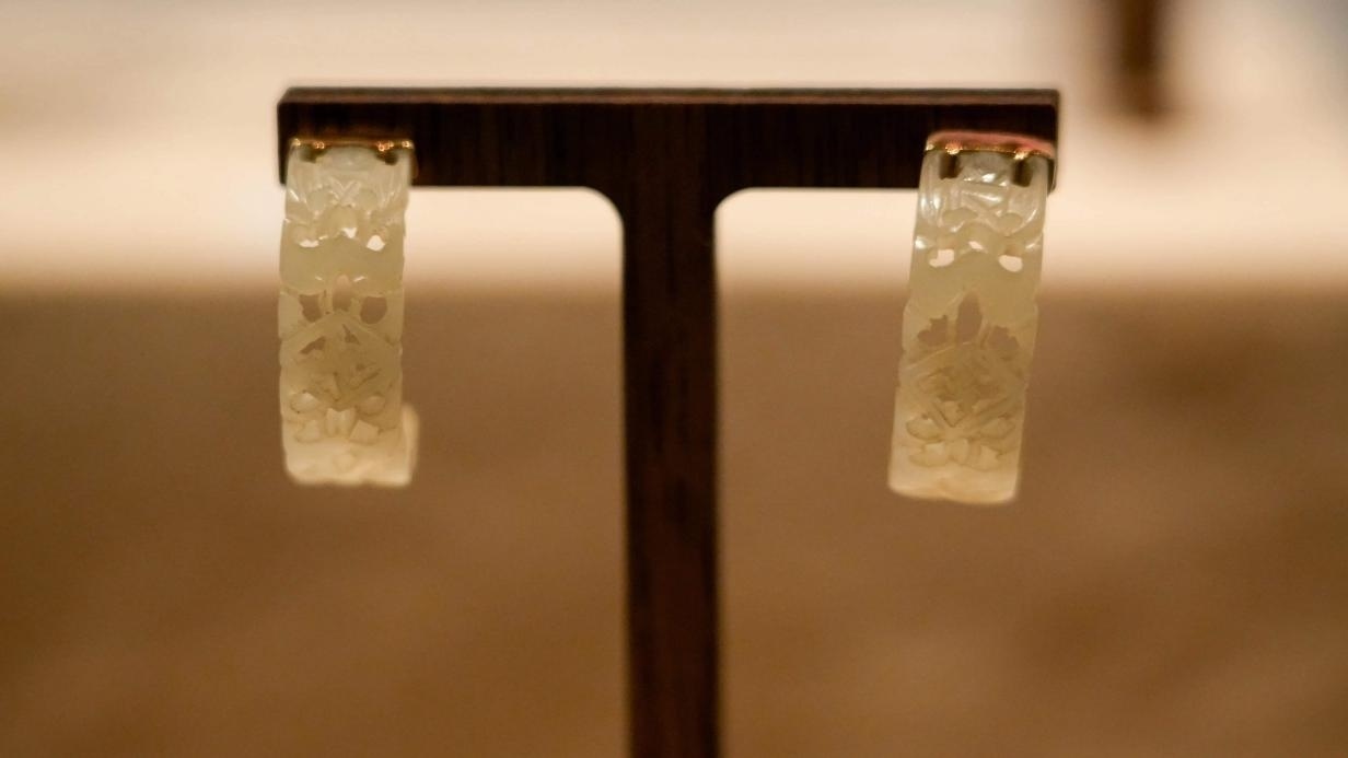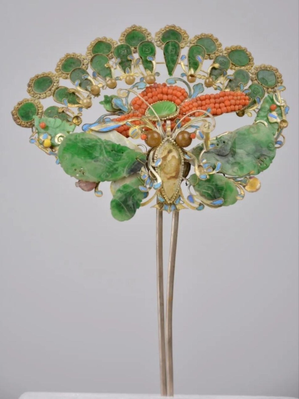 展览分为两个单元,第一单元「宫廷雅韵」陈列拼金龙袍、牙雕朝珠、玉蝴蝶头花簪、翡翠苍龙教子带钩等宫廷饰物,系统呈现清代上层社会的审美体系与礼制规范,也反映了当时首饰工艺的最高水平。