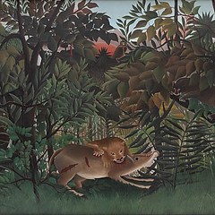 《饥饿的狮子正在撕咬羚羊》(Le lion, ayant faim, se jette sur l'antilope),Henri Rousseau,1898-1905年