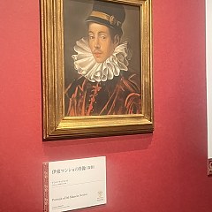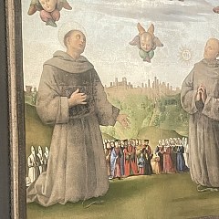 这幅画作出自拉斐尔的老师、15世纪意大利重要画家 Pietro Vannucci 之手,由佩鲁贾正义兄弟会的成员们委托创作,作为游行旗帜(gonfalon)使用。画作上半部分描绘圣母子和环绕他们的天使,下半部分描绘正在祈祷的圣方济各与圣伯尔纳定,以及一群头戴兜帽的信徒,画作人物刻画柔和优美,场景宁静和谐,体现 Vannucci 创作巅峰期的水准。