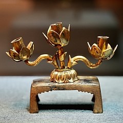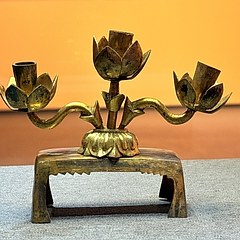 竹柄莲托缠枝三足铜烛台,辽代,滦平县博物馆藏