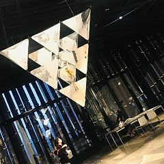 这件作品由模块相互紧扣而成,几何体的每个五边形平面由金属框架构成,部分平面镶有与金属框架齐平的镜子,部分平面空置。参观者可以从中看到作品内部用来固定平面的绳网,以可视化的方式展现了绷紧的物理力量。