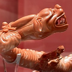 此器以整枝红珊瑚雕刻为游龙,颇为难得。龙回首摆尾,双目圆睁,巨口大张,口中含有可活动的宝珠,龙角后曳,挂有一包袱状的瑞器。龙身依珊瑚形态巧雕,背脊与龙鳞刻划清晰分明,四肢上雕有灵芝及攀肢小龙,形态各异,匠心独运。