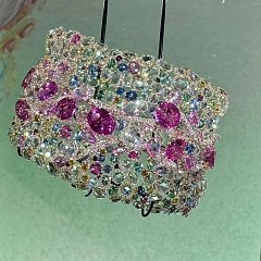 2023 Black Label Masterpiece 大师系列 帕米尔胸针「塞纳河春色手环」的创作灵感来自巴黎的塞纳河,珠宝艺术家 Cindy Chao 选取「倒映着河岸景色的水面」这一独特视角,大胆运用印象派的表现手法和创意方式,借鉴油画中色彩堆叠的原理,通过1936颗色彩清新的宝石呈现出塞纳河的盎然春色。