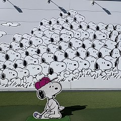 「花生帮画廊」以《花生漫画》(Peanuts)为主题,墙面铺设大面积复制原画,包括一幅花生帮骑车出行的经典场景。