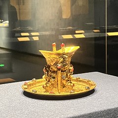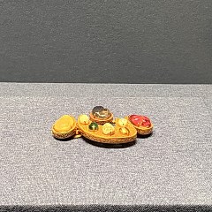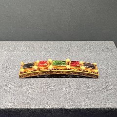 最值得关注的展品为定陵出土的「金翼善冠」(复制品),是明神宗万历皇帝的皇冠。这件金冠的「前屋」由518根直径0.2mm的细金丝手工编结而成,「后山」装饰二龙戏珠图案,龙首、龙身、龙爪、背鳍等部位均是单独制作再焊接组装,仅龙鳞的数量就达到8400片,体现了明代工匠在拔丝、编织、焊接方面的高超技艺。