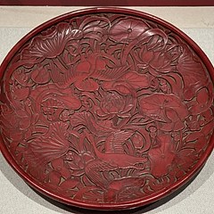 剔红荷塘双鸳纹圆盘,明代,辽宁省博物馆藏