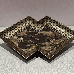 黑漆描金彩绘山水纹方胜式盘,清代,沈阳故宫博物院藏