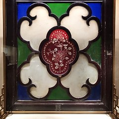 重要展品包括一件晚清民国时期的「宝相花圆镜格心彩色玻璃窗」,以「宝相花」棂花接「圆镜」开光作为格心样式,中部嵌蝙蝠铜钱图样套红玻璃,周围镶嵌绿、蓝、黄单色玻璃。「宝相花」纹样是魏晋南北朝以来随佛教盛行的传统吉祥纹饰,由莲花、牡丹、菊花组合形成;蝙蝠与铜钱组合则寓意「福在眼前」。