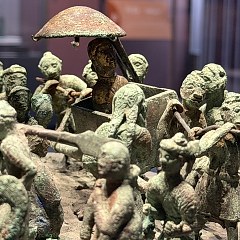 滇国青铜文明高度发达,滇人通过高超的冶铸技艺、写实的表现手法,将社会生活立体铸造在青铜器上,尤以贮贝器、扣饰最具特色。本次展览汇集诸多具代表性的古滇国青铜器,如狩猎场面贮贝器、二人盘舞鎏金青铜扣饰、四舞俑铜鼓等,展现古滇国的政治、经济、军事、文化等方方面面。