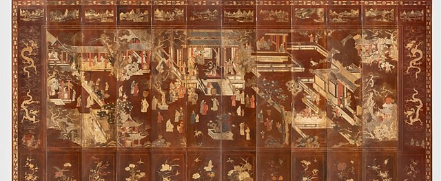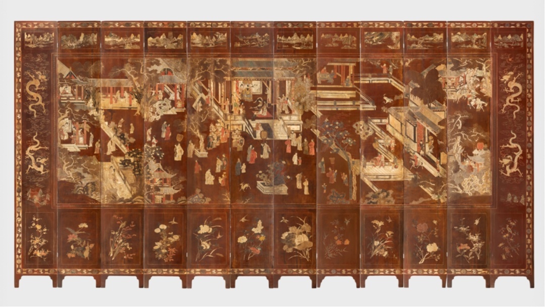 红漆款彩郭子仪庆寿图十二联屏风,清康熙(1704年),湖北省博物馆藏