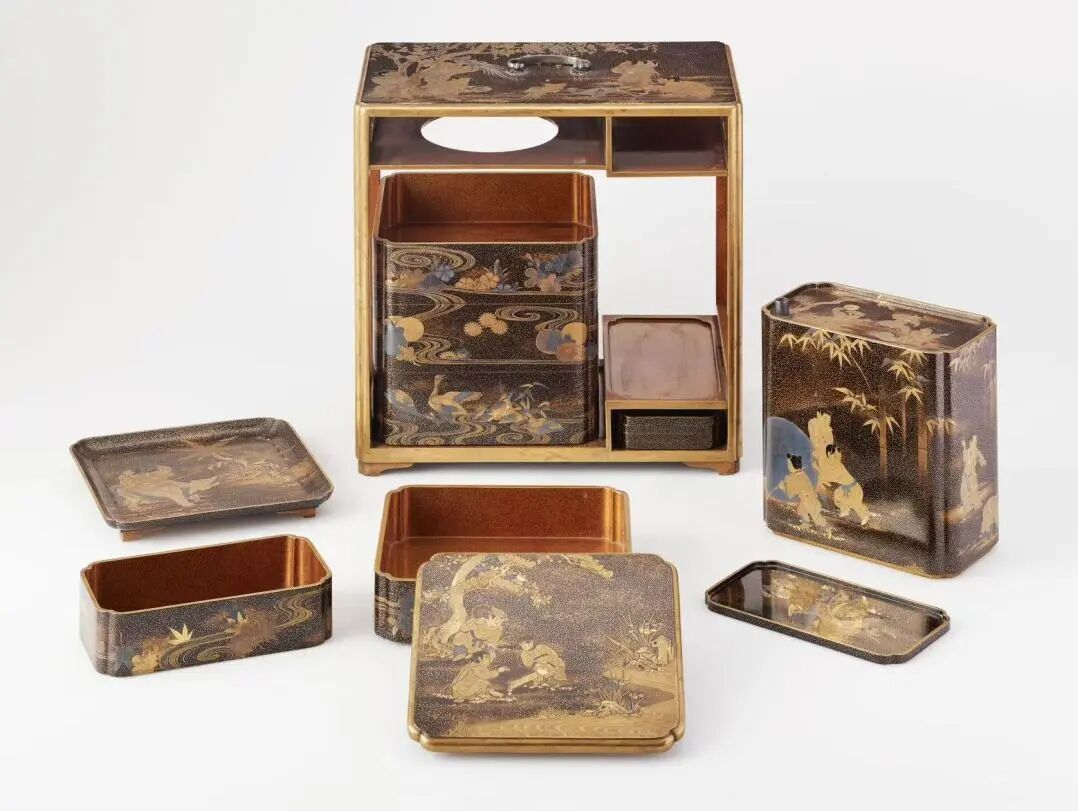 黑漆描金花卉纹婴戏图提重箱,日本江户时代末期,旧金山亚洲艺术博物馆藏