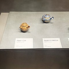 彩绘罗汉图急须,铭「为花月庵茶伯 周平造」,初代尾形周平作,田中鹤翁所用