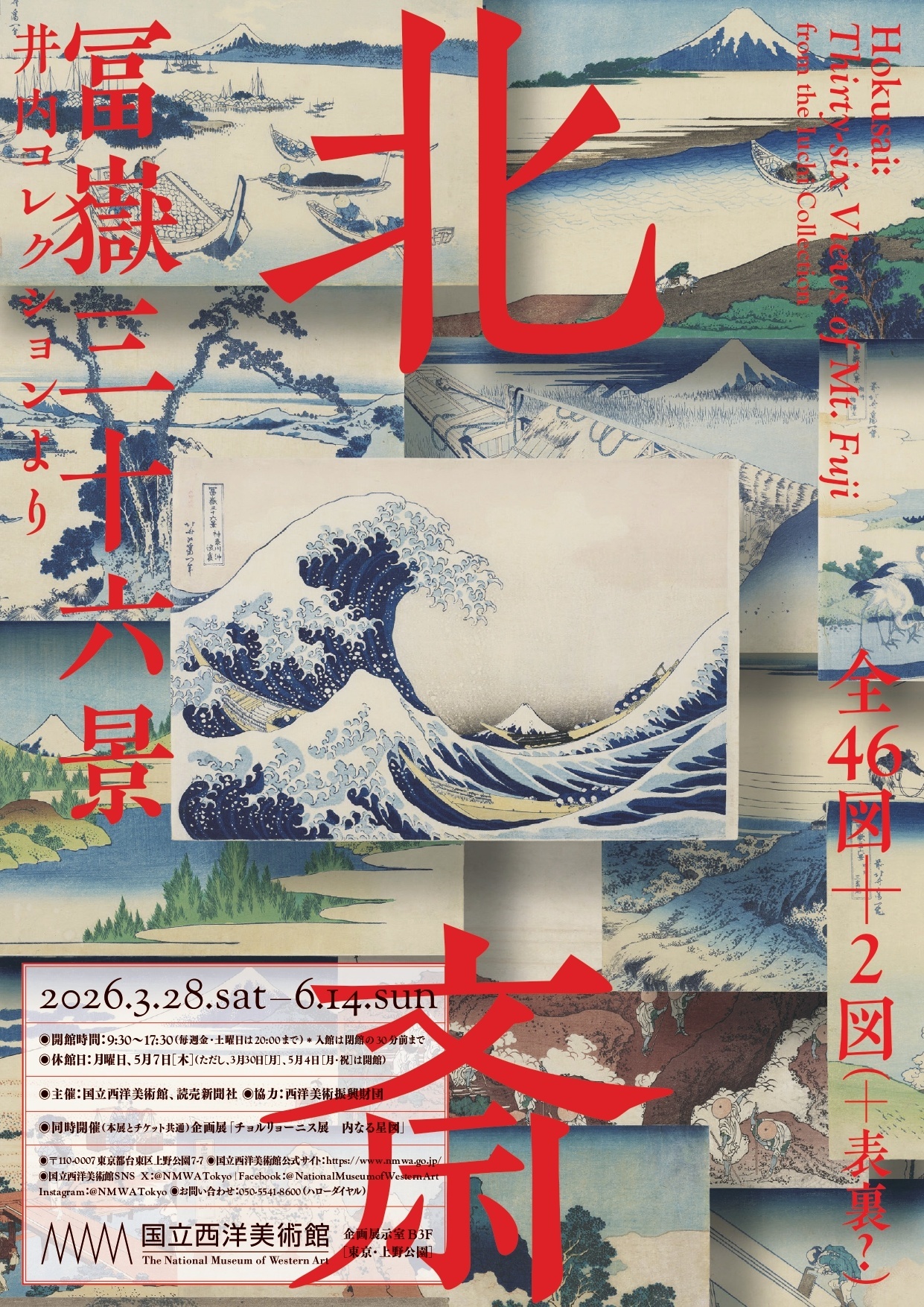 本次展览将首次公开展示2024年由井内收藏(Iuchi Collection)寄存至日本国立西洋美术馆的葛饰北斋《富岳三十六景》,完整呈现该系列全部46幅作品,邀请观众尽情领略《富岳三十六景》系列中的独特构图与色彩之妙。