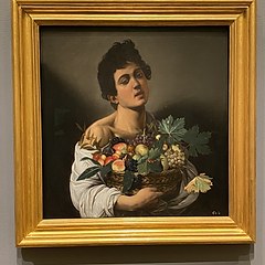 《捧着果篮的男孩》(Boy with a Basket of Fruit),Caravaggio,约1593年,意大利博尔盖塞美术馆藏