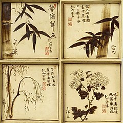 这是尾形光琳与尾形乾山兄弟合作制作的四角形盘,在白釉底上用含氧化铁的颜料勾画纹样,再覆盖透明釉烧制,盘面意境宛如水墨画般雅致。原为20枚一套,现存10枚。