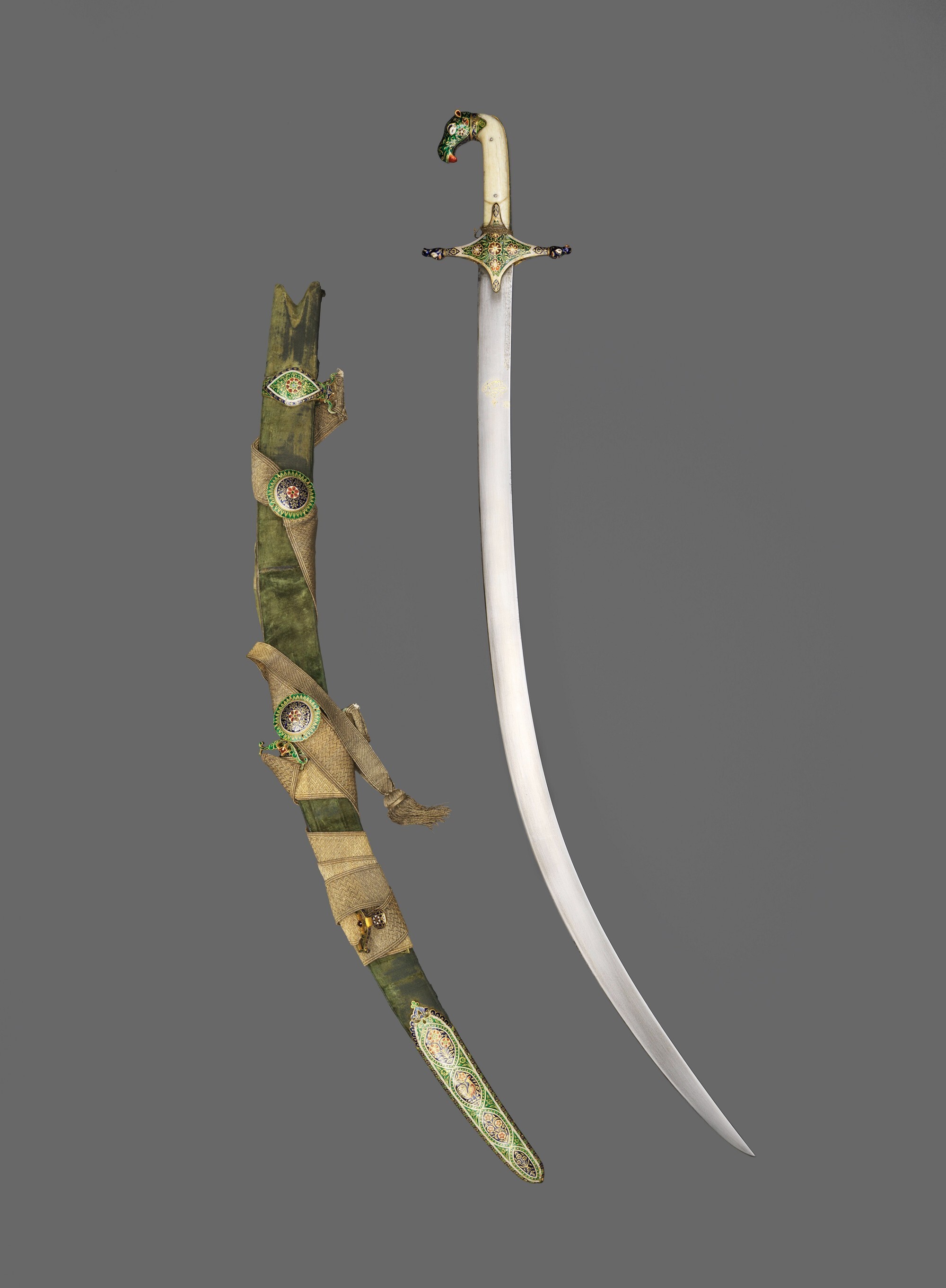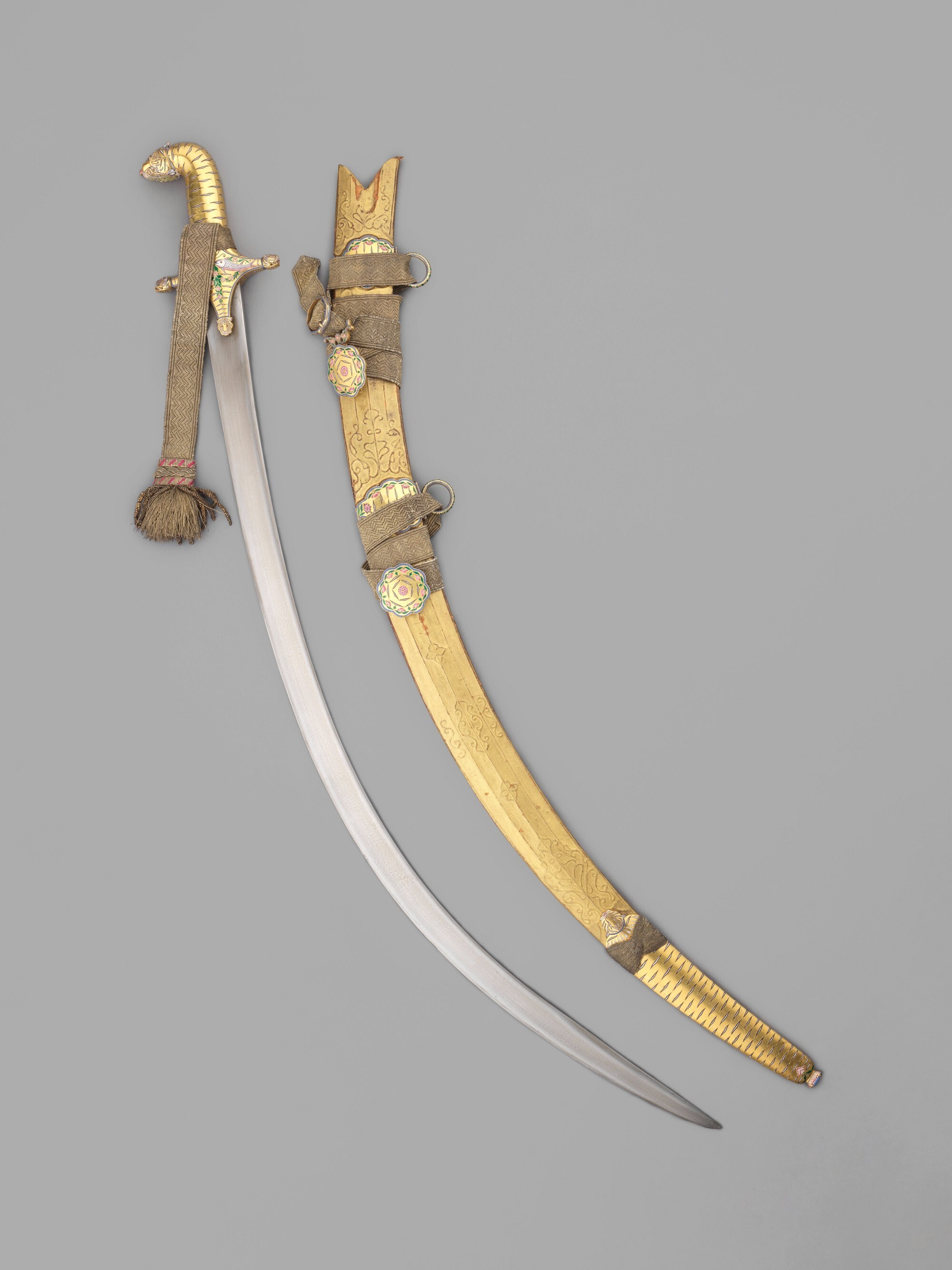 这些仪仗剑既是武器,也是地位象征,代表威望、忠诚与男子气概。它可作为外交礼物进行赠予,彰显受赠者的地位与价值。部分剑上有鱼形纹样,推测起源于莫卧儿皇帝授予阿瓦德早期统治者的荣誉徽章,属于阿瓦德宫廷身份的重要象征元素。