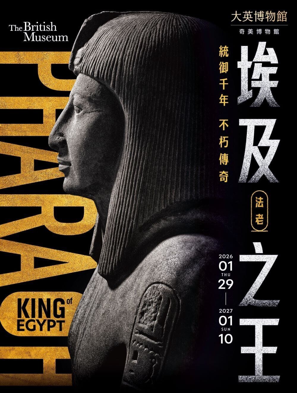 本次展览由奇美博物馆与大英博物馆合作举办,汇集280件藏品,包括珠宝、陪葬品、石雕、棺椁、文书信件等,时间跨度近3000年,覆盖拉美西斯二世、图坦卡蒙、哈特谢普苏特、亚历山大大帝等56位帝王的统治期,主要呈现古埃及王权制度的演变,揭示古埃及社会通过宗教仪式和象征语言巩固统治者「神化」的合法性。
