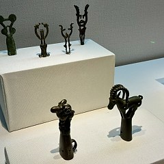 最有趣的展品包括战国时期的「双虎相拥纹银饰件」,饰件长4.5cm,采用高浮雕手法塑造两只相互撕咬嬉戏的幼虎,造型生动,线条流畅,虎尾特别以联珠纹表现,显现出翻转之态,体现了中国早期北方游牧民族高超的艺术水平和金属铸造工艺。