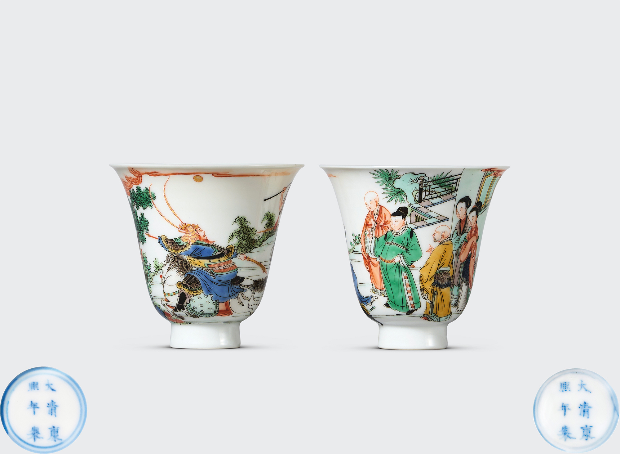 五彩西厢记人物故事图仰钟杯一对,清康熙