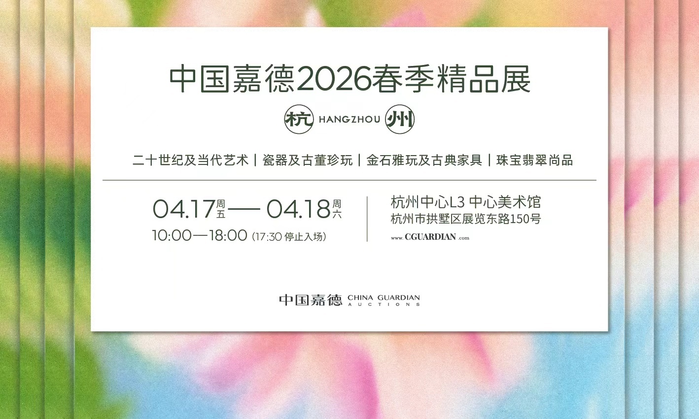 4月17日至18日,中国嘉德2026春季精品展在杭州中心美术馆举行,共呈现逾百件收藏级艺术佳品,涵盖二十世纪及当代艺术、瓷器及古董珍玩、金石雅玩及古典家具、珠宝翡翠等重要收藏门类。