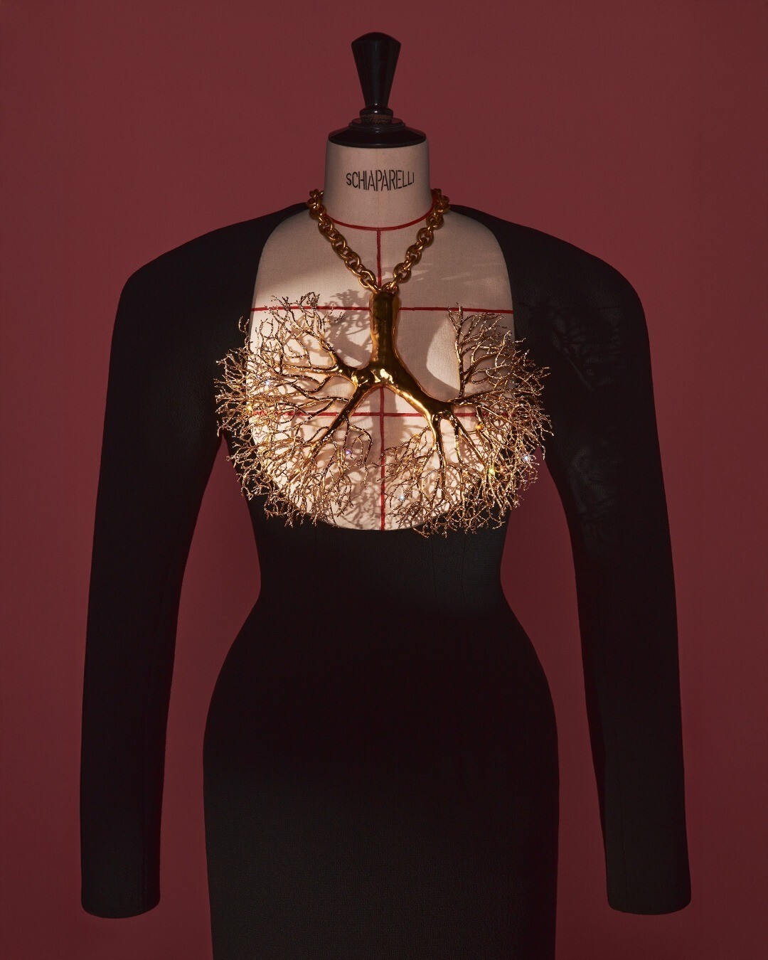 Schiaparelli 2021/22秋冬高定系列「Matador Couture」里的黑色晚礼裙与「呼吸系统」项链