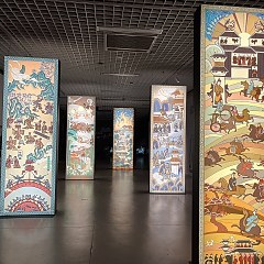 展览分为五个部分,第一部分「无问西东」通过数字影像和飞奔的天马雕像,再现丝绸之路意象;第二部分「汉画奇妙」以当代插画艺术重新演绎汉画像石场景,展出「早高峰日常」「烧烤指南」「草坪音乐会」「公园人才市场」「公园车展」五幅巨型插画。