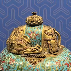 第二单元聚焦清宫各式器物的精湛工艺,亮点展品包括填珐琅嵌玛瑙葫芦瓶、铜镀金甪端香薰、仿木釉金里碗、青玉浮雕山水方盒、金胎穿珍珠手镯等。这些专供皇室的「奢侈品」,均为当时各类技术工艺的集大成者,生动展现清宫造办处如何聚天下良工,成帝王雅趣。