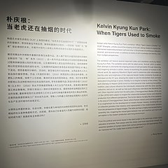 本次展览为中韩文化交流年特别活动,展出数件韩国艺术家朴庆根(Kelvin Kyung Kun Park)的重要影像及装置作品。展览标题「当老虎还在抽烟的时代」引自韩国民间故事,意指很久很久以前。
