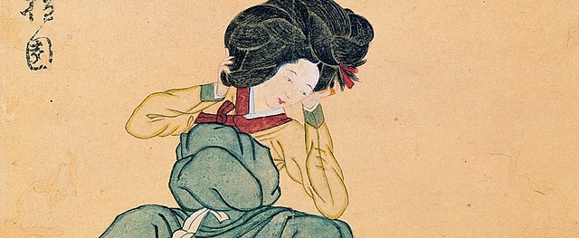 18世纪中期,受中国理学观念的影响,朝鲜半岛逐渐形成了一套普遍认可的女性妆容模板:线型流畅的服装、白皙的肤色、精致的妆面和发型。通过申润福等画家的作品,这种审美得以定格和流传。