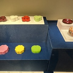 部分玻璃器为首次公开展出,体现了清宫玻璃厂的最高成就。亮点展品包括蓝色玻璃刻螭龙纹嵌宝石松花石砚盒,涅白玻璃珐琅彩百花不露地水丞、涅白玻璃珐琅彩手柄嵌宝配刀等。