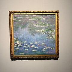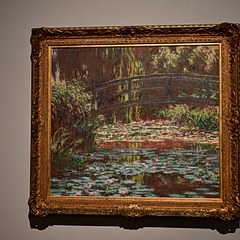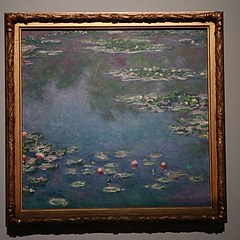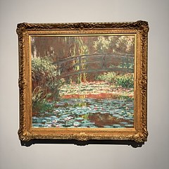 最重磅的展品为芝加哥艺术博物收藏的两件莫奈真迹《睡莲池》与《睡莲》。前者完成于1900年,画面中紫藤轻垂于桥栏之上,池中睡莲绽放,四周环绕着垂柳与鸢尾;后者创作于1906年,主画面近乎填满水面,倒映着天空与树影,蓝紫色调营造出一种迷离梦幻的氛围。