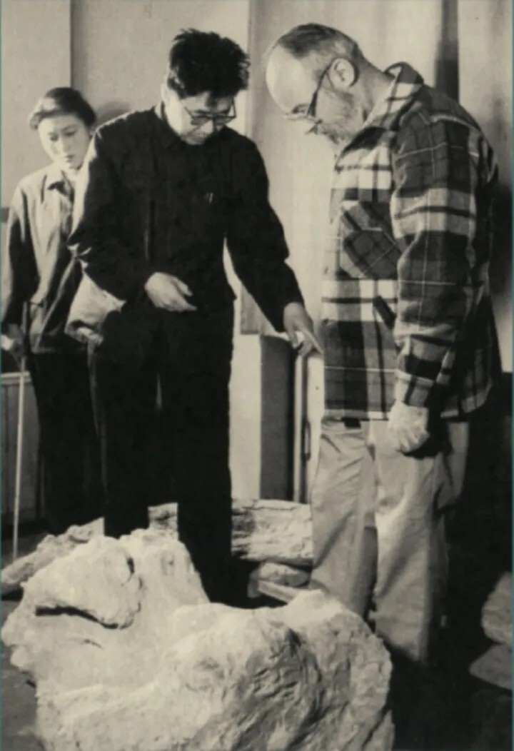 邱占祥(左)和戴福德(右)在榆社县化石博物馆观察剑齿象化石