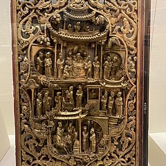 潮州木雕多髹漆饰金,因此又被称为「金漆木雕」,它以镂通雕技艺展现雕刻的立体性,又塑造出层层迭迭的多维度空间,附上民俗意蕴深厚的题材纹饰,展现潮汕地区的传统生活脉络。