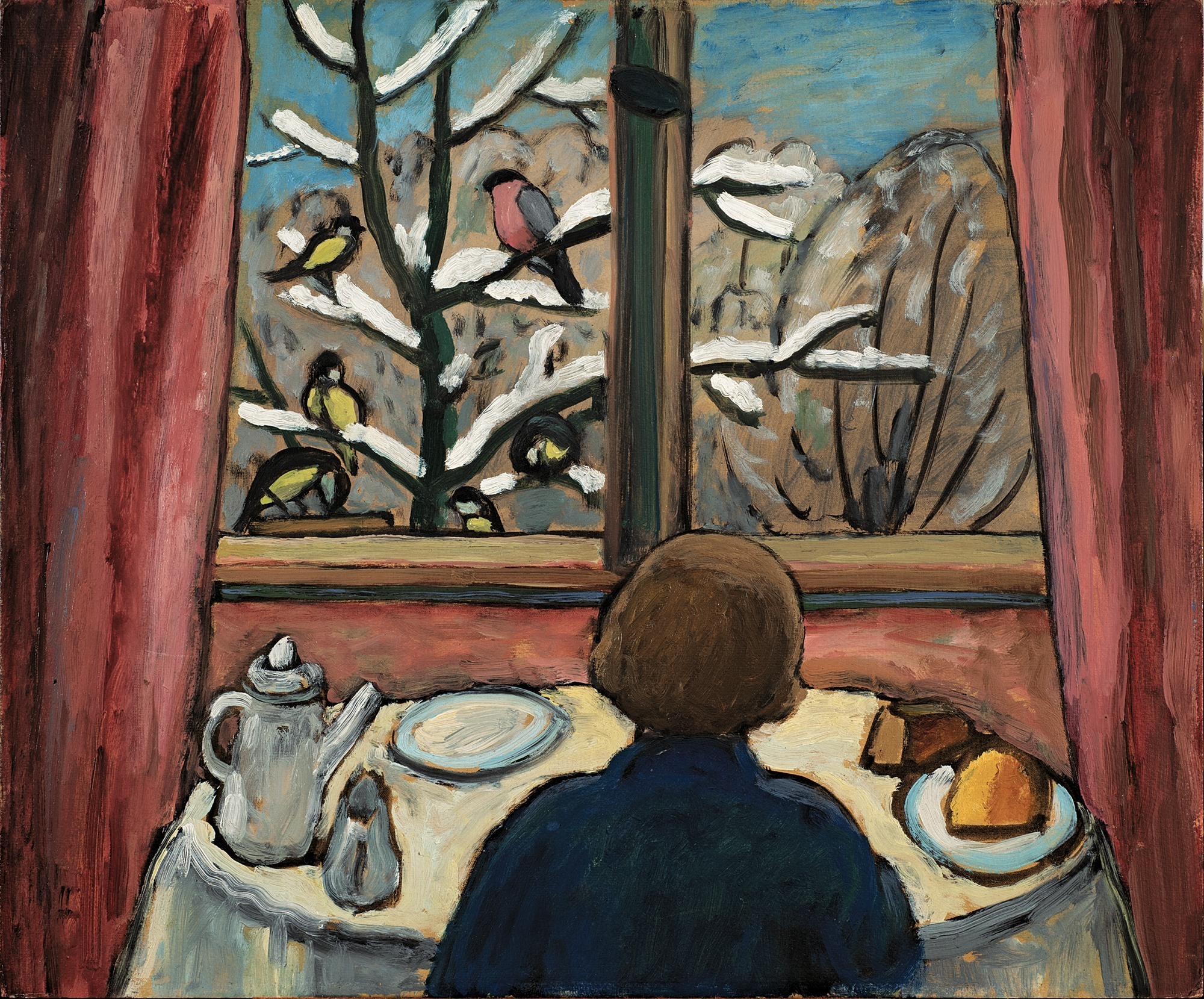 《鸟儿的早餐》(Breakfast of the Birds),Gabriele Münter,1934年,木板油画