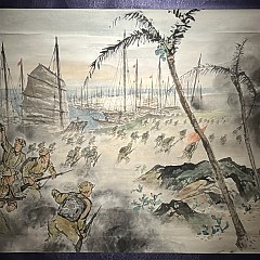 第二章「山河新貌」呈现关山月的山水画创作新面貌,展出《进攻海南岛》《长征路上》《闸坡渔港》《农村的早晨》等。新中国成立后关山月参与土改运动,在上山下乡、深入生活的过程中,思想经过了改造,山水画呈现出显著变化——壮阔的意境中,始终饱含昂扬向上的时代精神和革命英雄主义的色彩,这也成了他日后的主体艺术风格的基调。