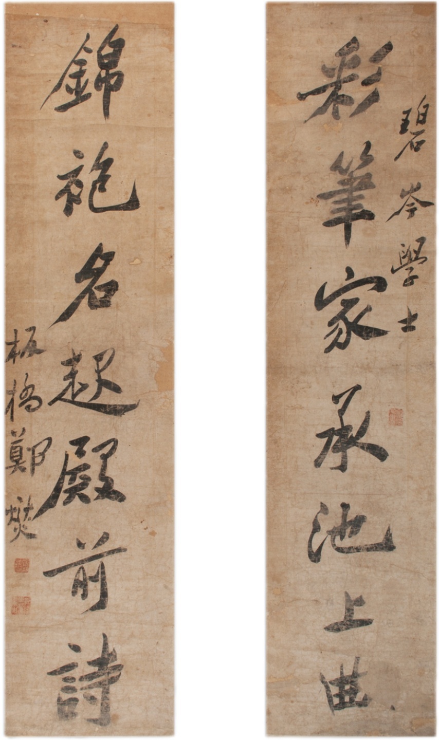 第二单元「清初遗韵」聚焦清代书法作品,体现承袭与创新间的平衡。傅山行草五言诗轴诠释「宁拙毋巧,宁丑毋媚」的美学主张,郑燮的行书七言联则是其 「难得糊涂」 哲学观的艺术外化。