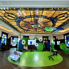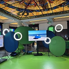 曹斐的《屏幕自传(上海)》是由不同尺寸的绿幕背景组成的装置作品。一系列短视频在 LED 监视器上循环播放,展区形成了一个临时的实时摄影棚。真实与虚拟、夸张与扭曲、熟悉与陌生之间的界限变得模糊不清,使参观者难以信任图像的现实性。
