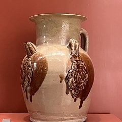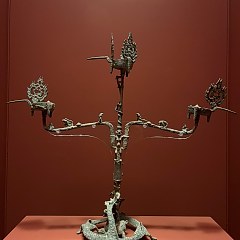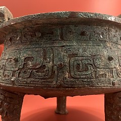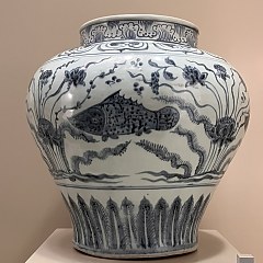 第一部分为新石器时代到20世纪初的文物。展品包括陶瓷、青铜器、玉器及石刻等,呈现了一个完整的中国历代文物史。展品中的明代洪武釉里红蕃莲纹玉壶春瓶、清代青花缠枝花卉纹僧帽壶和豆青釉印八吉祥纹三足盘。