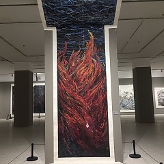 激动人心的个展!刘一原的水墨当然是根植于传统泼墨手法的,但亦很明显在画面结构和气质上呈现出波洛克的泼点画的特征,但是更为具象,可以说是有具象对象的抽象绘画。在我看来,刘一原的画作呈现出存在主义式唯物主义的精神内涵,即认为世界乃至于宇宙总体上是混沌而悲观的,由不可阻挡的毁灭性力量组成,因为他的画面是由类似于空间的背景,以及在其中冲撞的混乱而有动感的线条构成的。画作的尺寸一般来说相当巨大,这也印证了“画作即宇宙”的观点,因为巨大的物体总是包含着“崇高”的感觉,在这种尺寸下,我们眼中的水墨涌现出了超越其本身客观属性(即混乱线条)的巨大精神冲力。画作是悲剧,因为它表现的宇宙是对人类来说悲剧性的宇宙,那么出路在哪里呢?一幅叫做《体征》的画作似乎揭示了出路。这幅画作有倒十字、密密的乌云、天空中闪耀出来的金光。倒十字既可以被看作是敌基督、路西法、魔鬼,也可以看作是受难的圣保罗,但我认为这象征着人类本身。密云当然是灾难性的宇宙,而金光呢?是天国、最后的审判和救赎。这就显示出一种宗教意味,一种救赎意识,一种希望。但画家的宇宙是混乱而邪恶的,为什么这里又有十字架呢?这就显示出一种观念的断裂,但我更愿意把它理解为一种激情的、浪漫主义的信仰之跃,正如克尔凯郭尔所强调的那样。