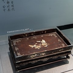 展览共分为三单元,第一单元「文房四宝」的展品包括象牙管微雕笔、嵌螺钿圆砚盒及墨、描金云龙纹宫绢、青花圆瓷砚等。文房四宝以端砚及歙砚、湖笔、徽墨、宣纸为其中翘楚。