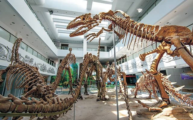 「生命起源与进化」以地质历史中的生物进化为主线陈列,展现地球生命38亿年的进化历程。展厅中陈列9具恐龙骨架、恐龙足迹化石及6个电动机器恐龙。