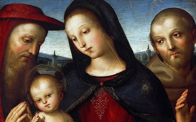 《圣母子、圣哲罗姆与弗朗西斯》(Maria with the blessing Child with Saints Jerome and Francis),Raphael,1502年,画廊博物馆藏