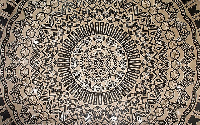 在展品「符号新观」中,古妮拉·克林伯格通过抽样、重复、镜像等方式将图案转换,形成一幅巨大的密宗图腾,覆盖在美术馆一楼临街的落地玻璃上。