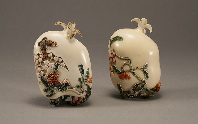 象牙雕茜色蝴蝶纹石榴形盖盒,清末,东莞市博物馆藏