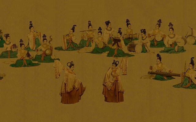 成都永陵是前蜀开国皇帝王建的陵墓,其棺床上的石刻浮雕「二十四伎乐」是中国本土音乐与外来音乐相互融合的集大成之作。整体浮雕乐伎均为女性,其中舞伎2人、乐伎22人,演奏乐器包括弹拨、吹奏、打击三类,共计20种、23件。音乐性质属于以龟兹乐为主的唐代宫廷燕乐。
