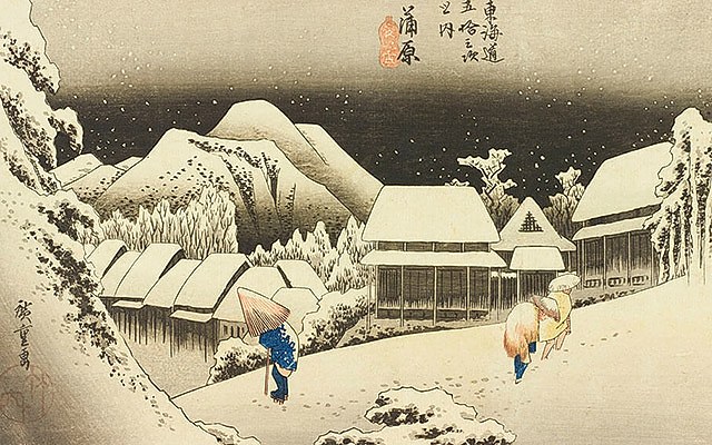 《东海道五拾三次之内》之「蒲原 夜之雪」,歌川广重,太田纪念美术馆藏(前期展品)