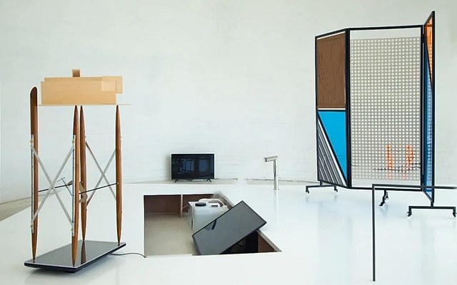 《样板间 – 如何共同居住》,胡伟,录像、桦木、布料、钢、亚克力、造雾机、木板、LED屏、透明片、印刷品,2020年,由艺术家本人提供