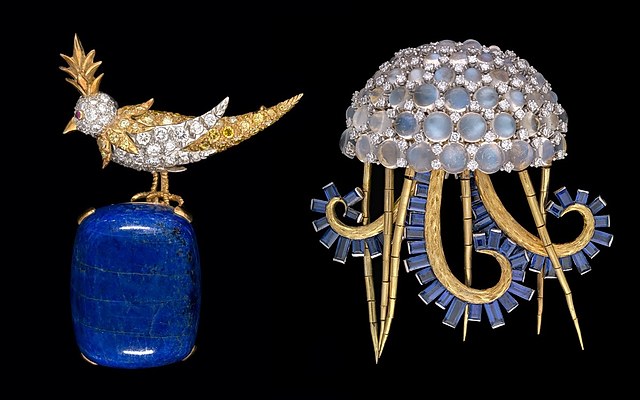 本次展出的珠宝由美国慈善家 Rachel Mellon 捐赠给弗吉尼亚美术馆,涵盖项链、手镯、胸针、烟盒等多种类别。最特别的展品包括一枚水母形状的胸针——1967年 Rachel Mellon 在海边意外被水母螫伤,因此订制了这枚胸针作为纪念。