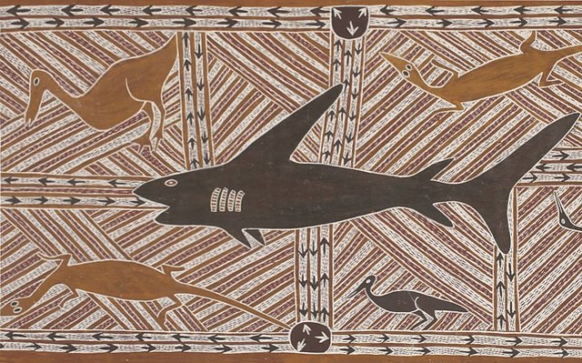 《神祖姜考务与鲨鱼马纳在加普氏族》,穆特提奇卜伊·芒南古拉,1967年,来自阿纳姆地东部的伊尔卡拉